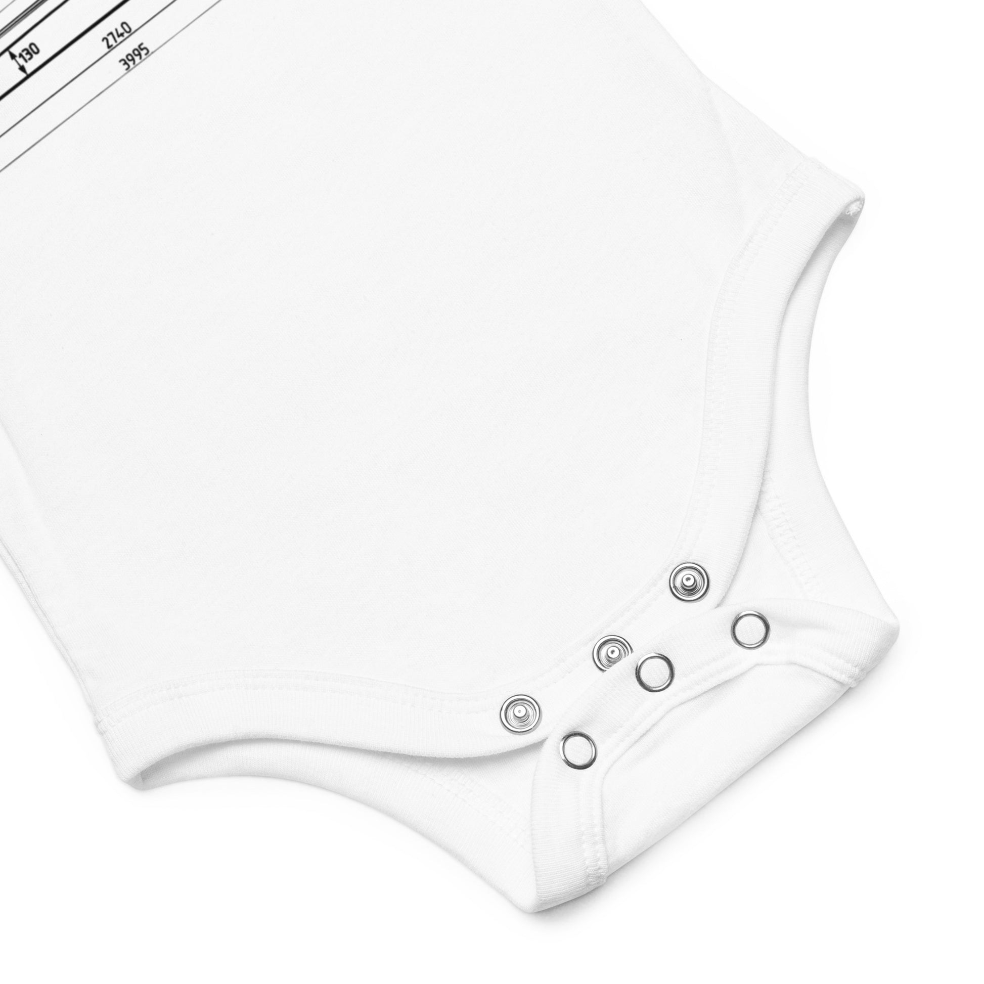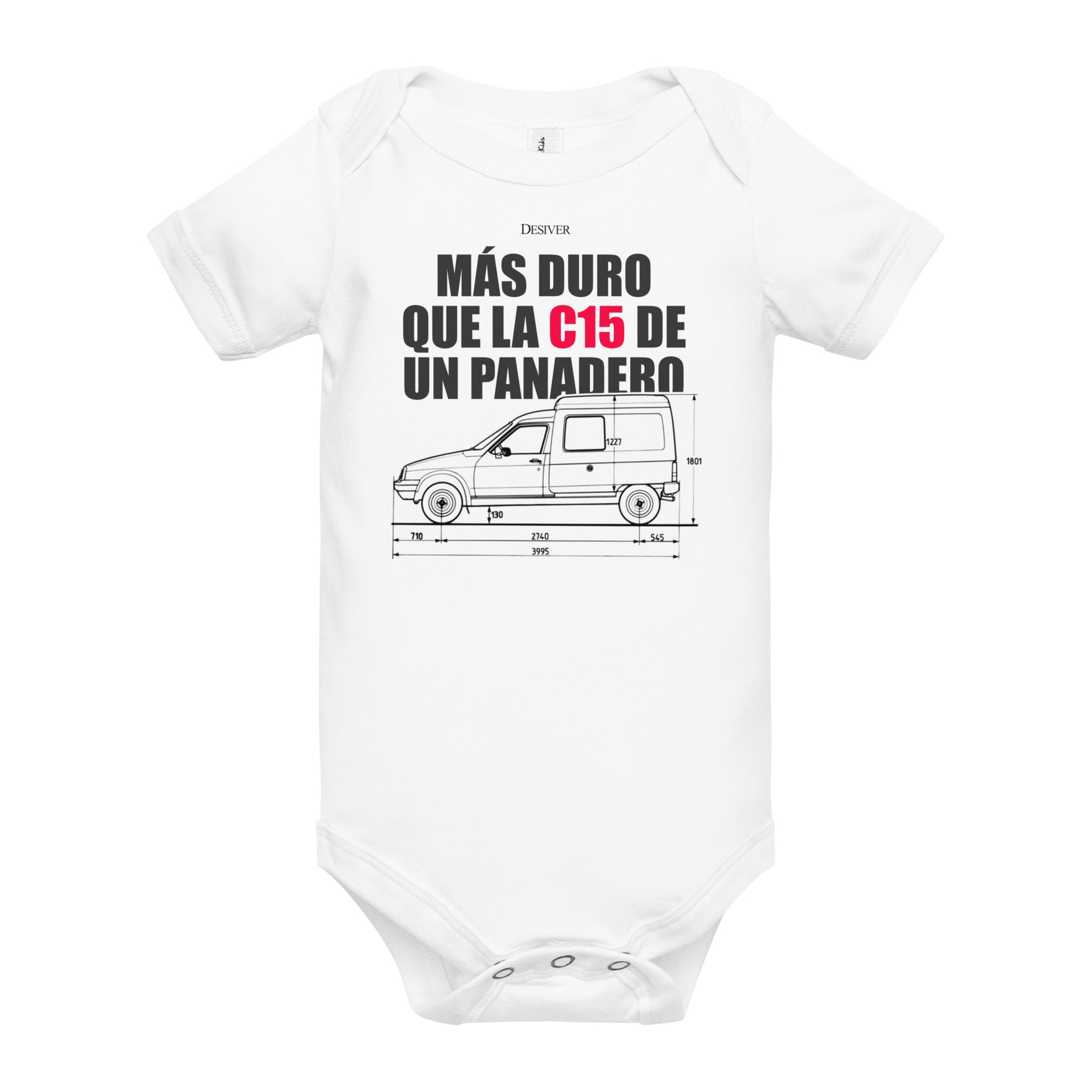 Con más dureza que edad. Tres cierres de broche en la parte inferior para cambiar el pañal cómodamente, un cuello con pliegues y un estampado tremendo que hará a prueba de peligros a tu bebé.